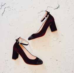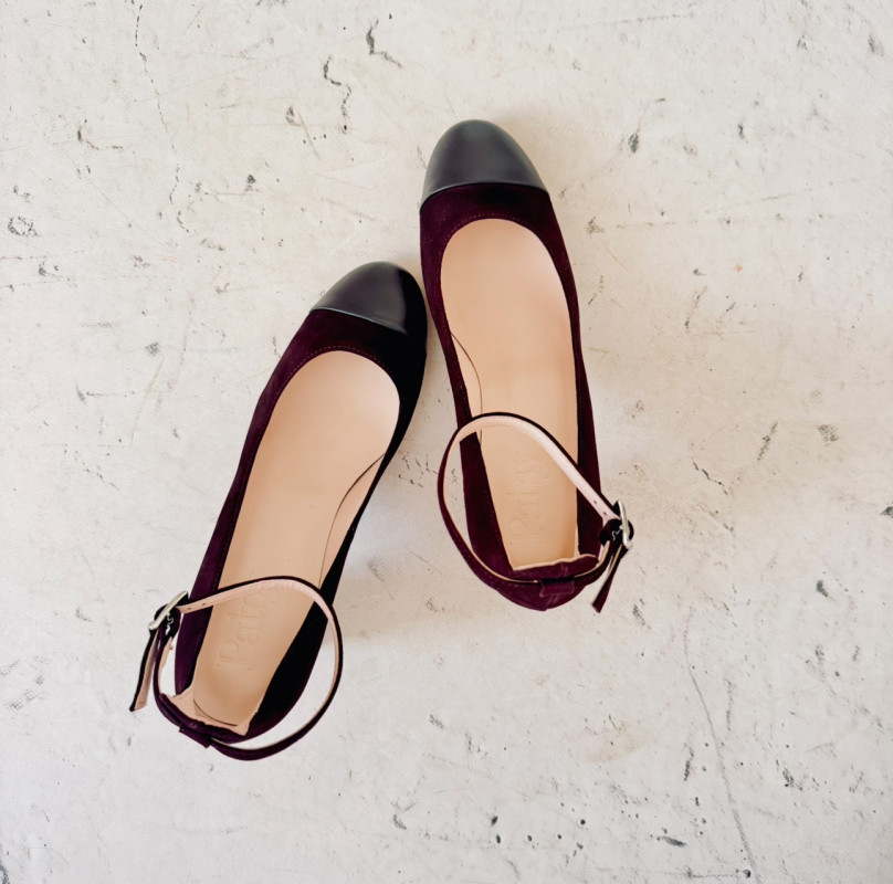 Zapato de tacón en ante marrón y puntera piel marrón.