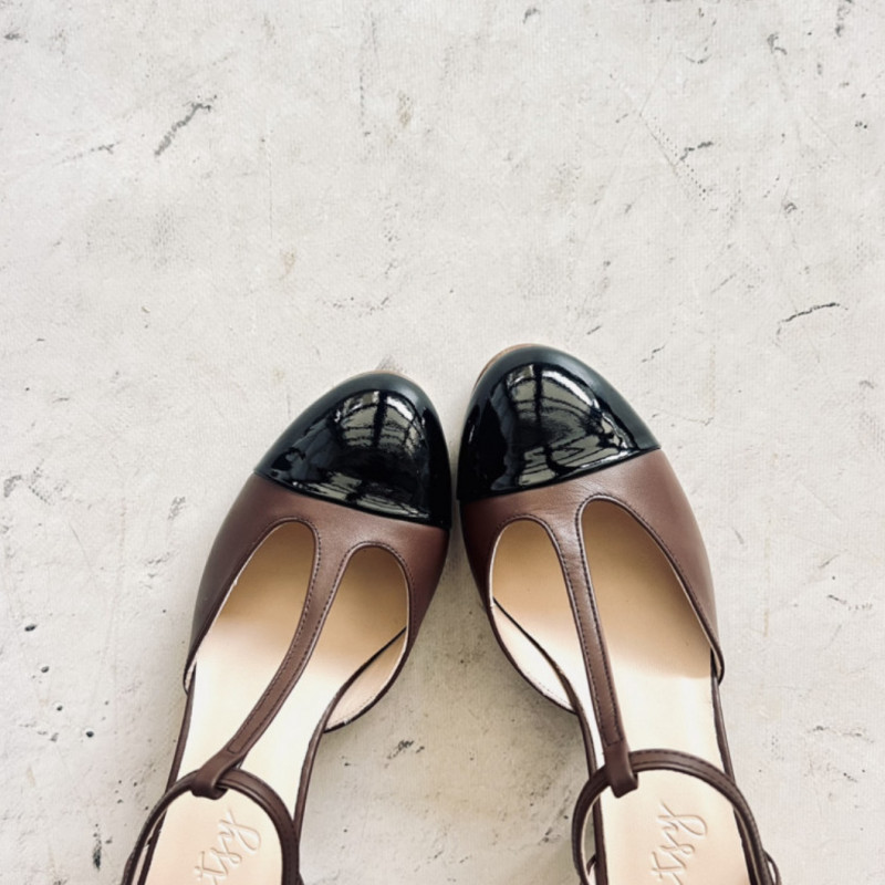 Zapato de tacón en piel color marrón y puntera charol negro.