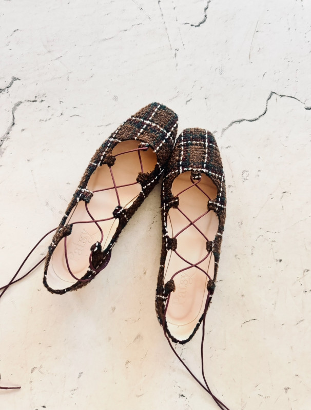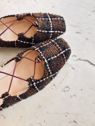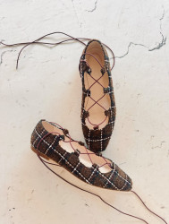 Bailarina plana acabada en punta ligeramente cuadrada en tejido en tonos marrones. Cordonera extra en tono marrón.