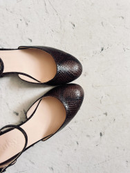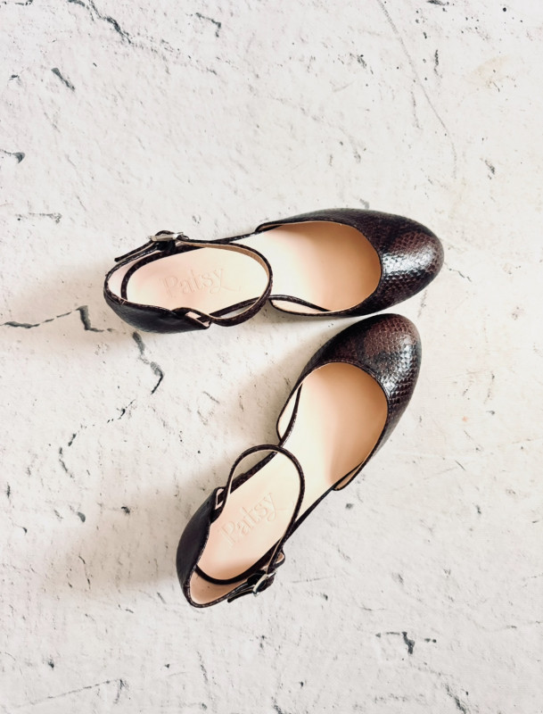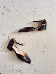 Zapato de tacón midi en piel snake marrón.