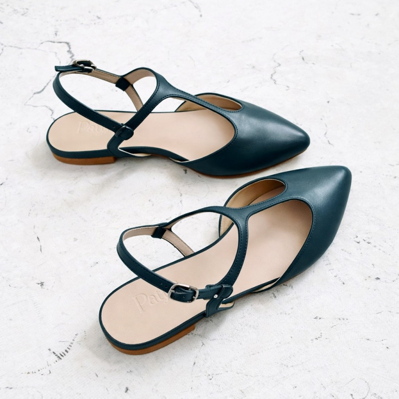 Mercedita destalonada en piel color azul petróleo. Cierre regulable con hebilla.