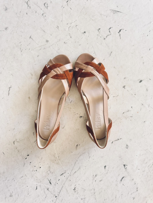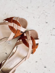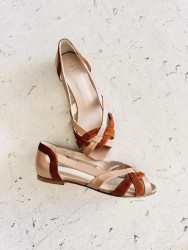 Zapato plano abierto por delante en ante color marrón y piel color maquillaje.