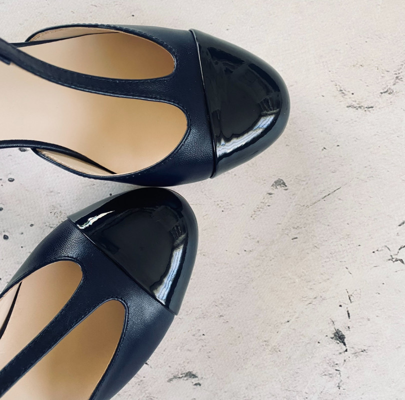 Zapato de tacón medio y punta redondeada en piel color negro.
