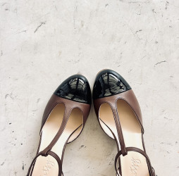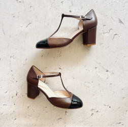 Zapato de tacón en piel color marrón y puntera charol negro.